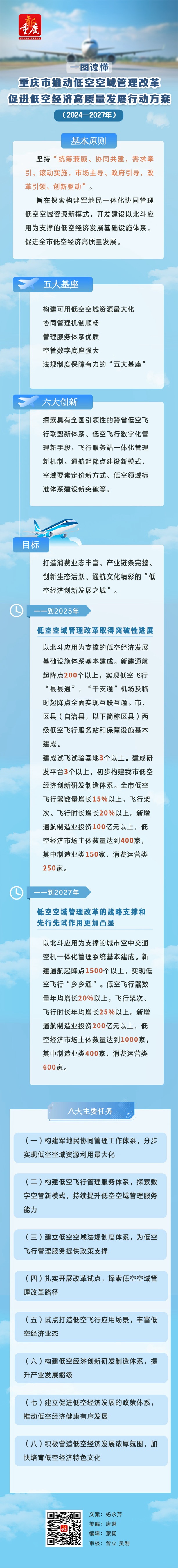 到2025年,重慶低空空域管理改革取得突破性進(jìn)展,以北斗應(yīng)用為支撐的低空經(jīng)濟(jì)發(fā)展基礎(chǔ)設(shè)施體系基本建成;新建通航起降點(diǎn)200個(gè)以上,實(shí)現(xiàn)低空飛行“縣縣通”“干支通”機(jī)場(chǎng)及臨時(shí)起降點(diǎn)全面實(shí)現(xiàn)互聯(lián)互通,低空經(jīng)濟(jì)市場(chǎng)主體數(shù)量達(dá)到400家。